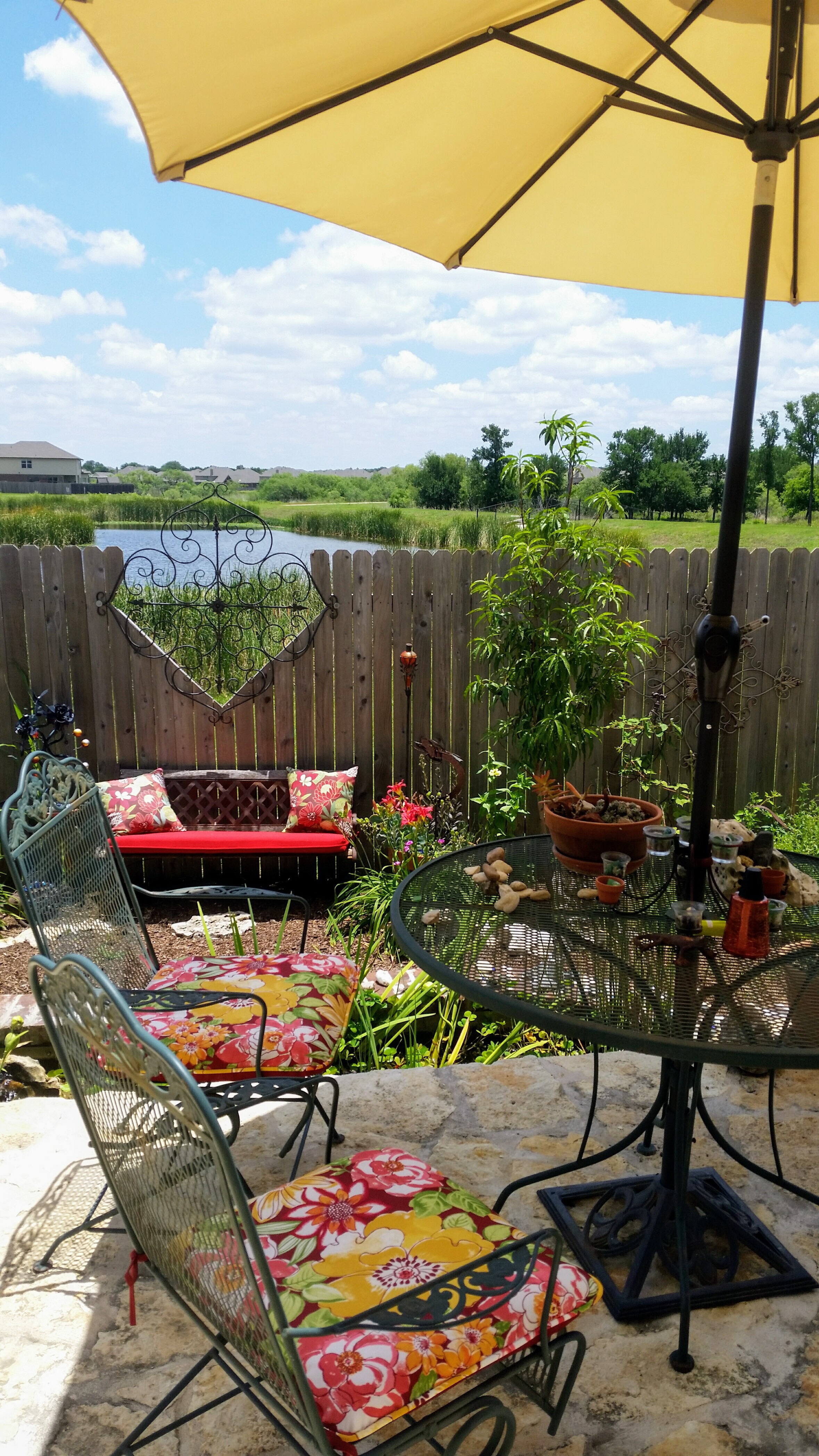 Stones, seating and benches can also add interest, texture and color…with so many great online deals for sun shades, umbrellas and do it yourself pergola there are a myriad of ways to add privacy, shade and an opportunity to create something pretty special on a budget.